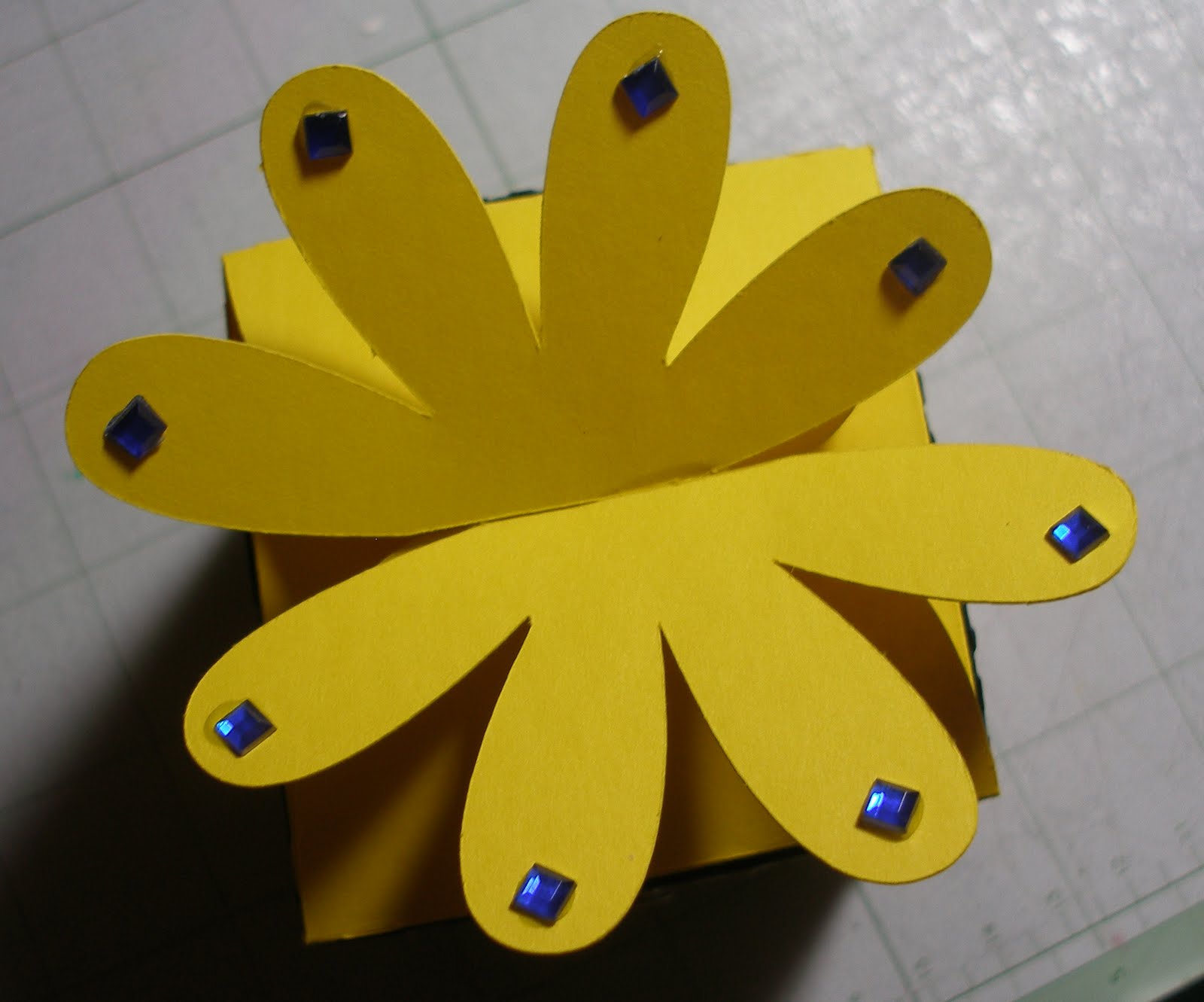 After we got home, I finished a little "back to school" project for my friend's daughter. Megan will have a locker at school this year and so I made her magnets that spell out her name and a little gift box to put them into. The magnets are pretty easy to make. I cut yellow and blue cirlces out with my cricut and modgepodged them to the back of glass globs. Let that dry and then adhered magnet circles to the back with E5000. Love that glue. I used my cricut and SCAL to cut out Megan's name in blue and yellow vinyl and adhered them to the front. You guessed it, her school colors are blue and yellow. Then I used my Tags, Bags, Boxes and More cart to cut out the flower box on page 120. I didn't even use Design Studio for this. I used a 12 x 12 sheet of paper and I used the fit to page button and cut it out. He came out to be about 2 1/2 inches high and wide. I loved it. Then I used my Accent Essentials cart and cut out 4 different shapes with super glossy yellow paper. I used SCAL to cut out 4 blue squares 2 1/4 x 2 1/4 and embossed them with my Spots and Dots cuddlebug folder. Love it. I used some bling for the flower on top in blue. Then I adhered them all together and put them on the box and here you go. A cute little gift box. I love the way the flower ontop embellishes it too. Hope you enjoyed today's posting and we will see you again soon.